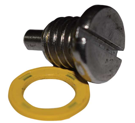Drain Screw for Mercury Mariner 2-cyl, 18-40 Hp | 3-cyl, 30-70 Hp | 4-cyl, 35-140 Hp | 6-cyl, 150-200 Hp | V6, 150-225 Hp outboards. With yellow rubber bonded washer.